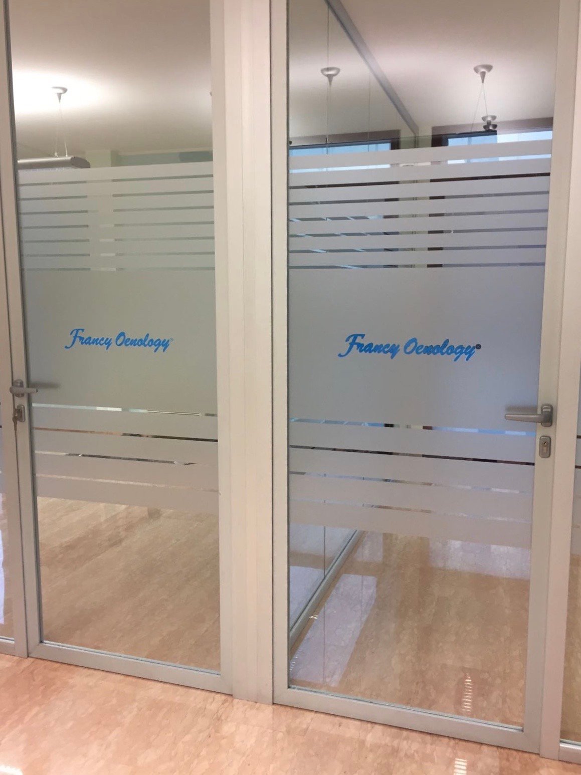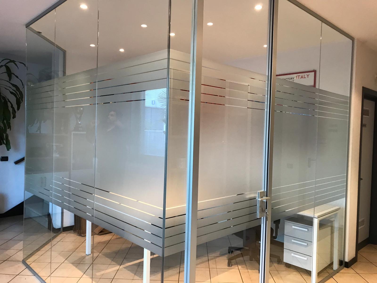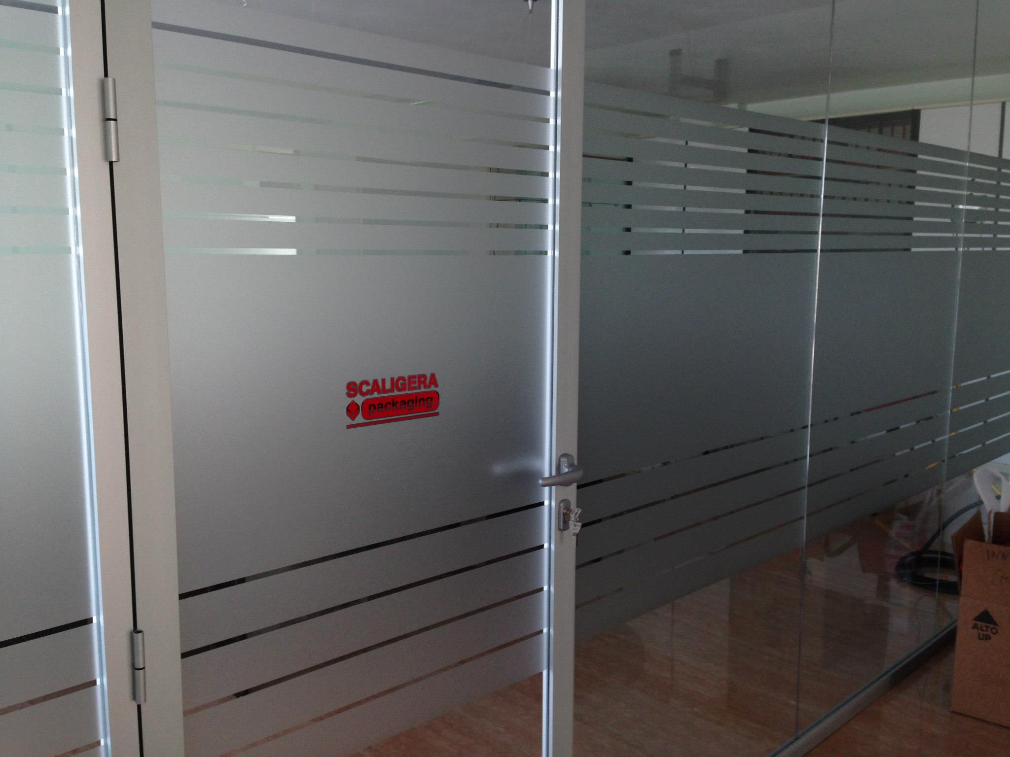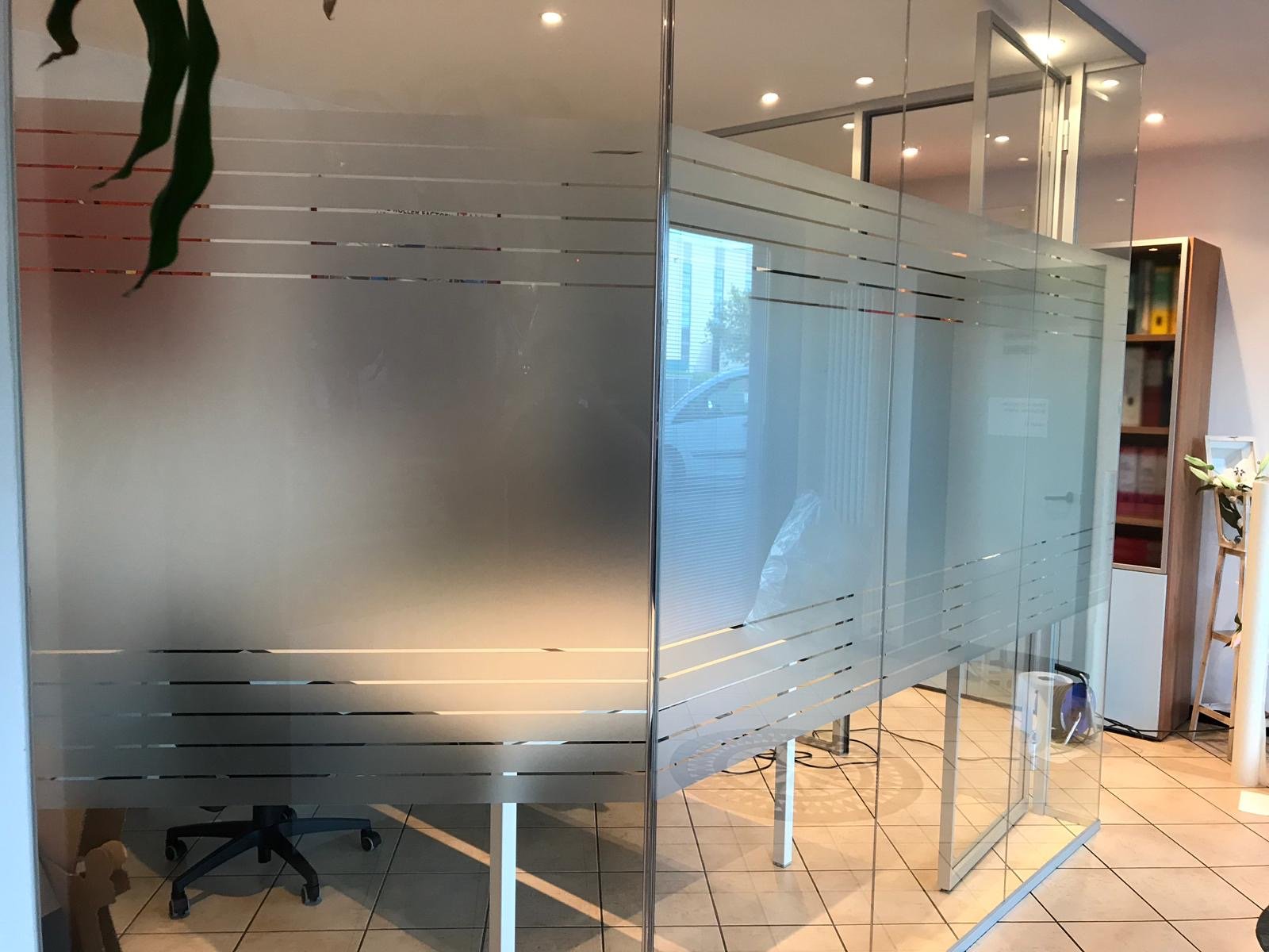 Le vetrofanie per negozi non si limitano alle sole vetrine infatti ultimamente vengono usate anche all’interno di uffici per dividere gli ambienti in modo elegante e originale con la pellicola effetto sabbiato o satinato, inoltre l’uso del vetro al posto delle pareti permette di avere ambienti più luminosi.
